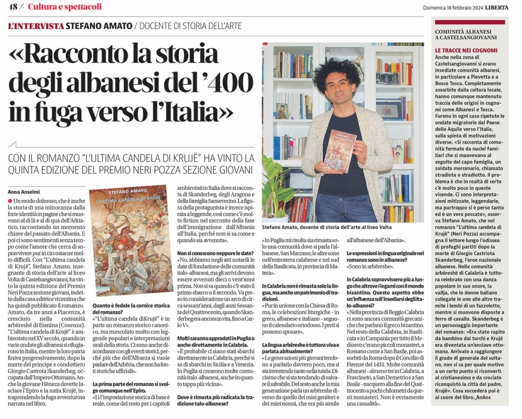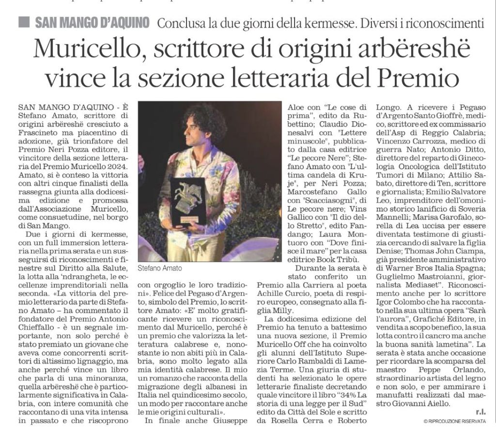 È Stefano Amato, scrittore di origini arbëreshë cresciuto a Frascineto ma piacentino di adozione, già trionfatore del Premio Neri Pozza editore, il vincitore della sezione letteraria del Premio Muricello 2024. Amato con “L’ultima candela di Kruje”, edito da Neri Pozza, si è conteso la vittoria con altri cinque finalisti della rassegna giunta alla dodicesima edizione e promossa dall’Associazione Muricello, come consuetudine, nel borgo di San Mango.